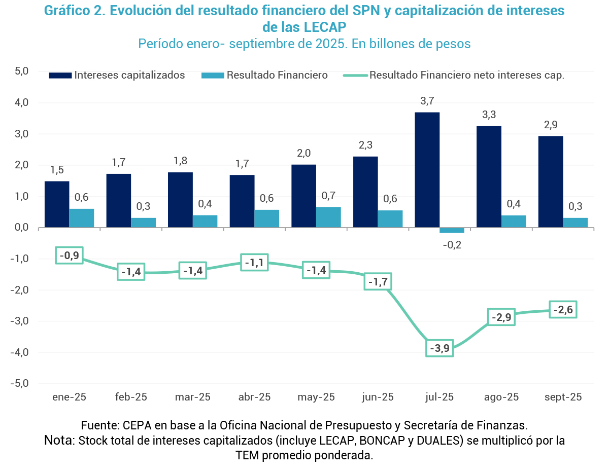 A su vez, al incluir la capitalización de estos títulos en el resultado financiero de 2024, se observa que pasaría de un superávit de $0,91 billones a un déficit de $9,23 billones. Esto se a que, a pesar de que esta practica se origino en marzo de dicho año, los intereses capitalizaron acumularon $10,14 billones. En consecuencia, desde enero 2024 hasta septiembre 2025 se acumularía un déficit financiero de $26,44 billones, en vez de un superávit de $4,53 billones, si se contempla esta capitalización de intereses.