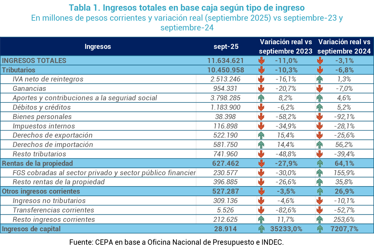 - Incremento real en los ingresos: los ingresos totales alcanzaron $11,63 billones, observando una caída interanual del 3,1% en términos reales explicado parcialmente por la finalización de la vigencia del Impuesto PAIS, en comparación con septiembre 2023. En los primeros nueve meses de 2025 se puede observar una caída en los ingresos de 7,6% en relación con el mismo período de 2023.