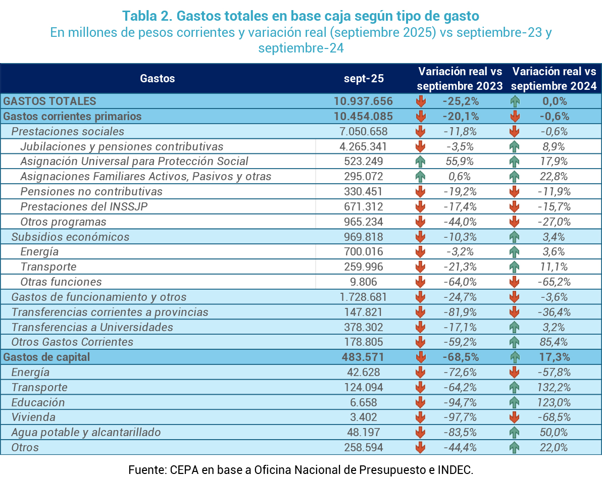 En septiembre de 2025, los subsidios económicos registraron una caída del 10,3% en términos reales respecto del mismo mes de 2023. Si bien dentro de esta partida se redujeron todos, se destaca la contracción de los subsidios al transporte un 21,3% en relación con 2023 explicado por la decisión del gobierno de discontinuar las compensaciones tarifarias al transporte público en el AMBA a través del sistema SUBE, aunque muestra una recuperación del 11,1% i.a.