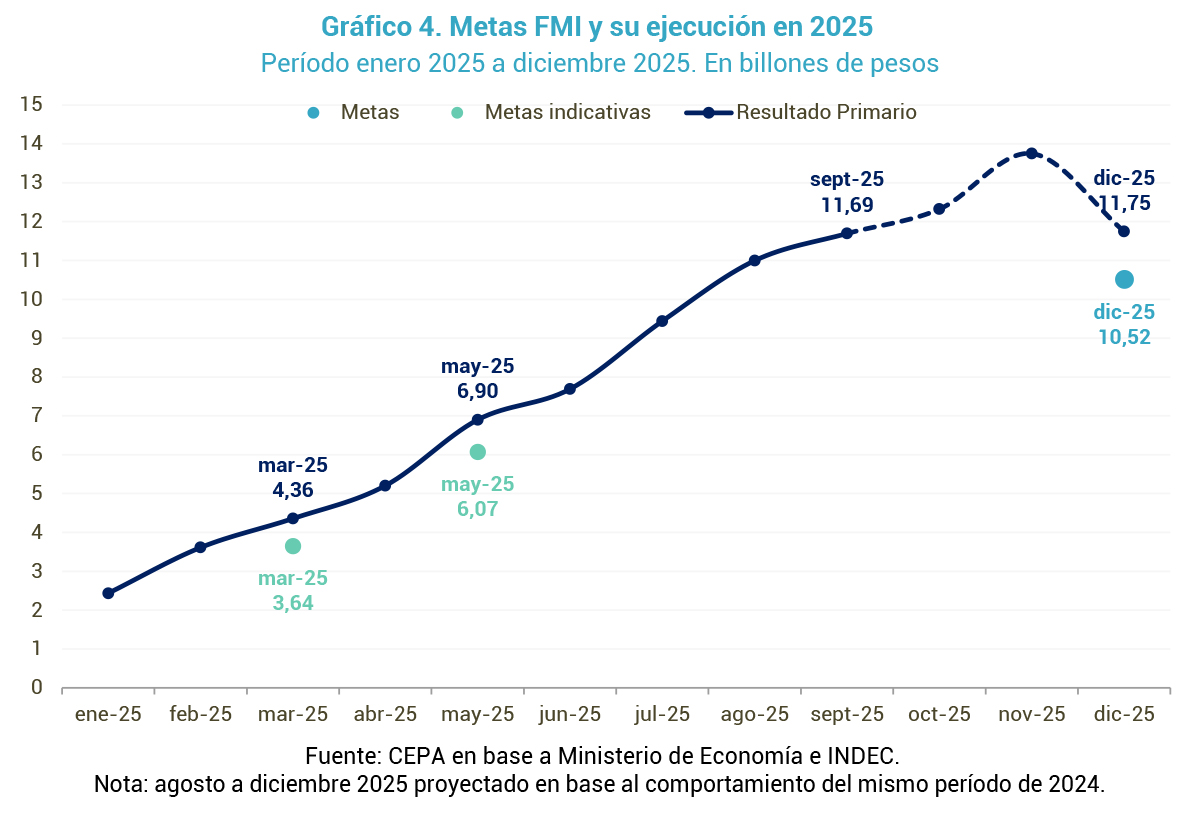Originalmente, en el Staff Report del FMI se detallaron metas indicativas (estimaciones del organismo) y metas estrictas en materia fiscal. El monitoreo se realizará sobre el resultado fiscal acumulado de 2025, siendo la meta que debía cumplirse para habilitar un desembolso era necesario acumular $9,30 billones de superávit fiscal en septiembre. Sin embargo, en la revisión del 1 de agosto se eliminó la meta de septiembre, mientras que la de diciembre pasó de ser indicativa a estricta, requiriendo acumular $10,52 billones para dicho mes.