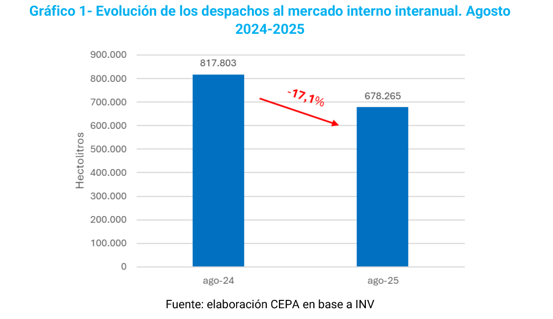De acuerdo con los datos de comercialización publicados por el Instituto Nacional de Vitivinicultura (INV), en agosto de 2025 se registró una caída interanual del 17,1% en el volumen total de vinos despachados al mercado interno.