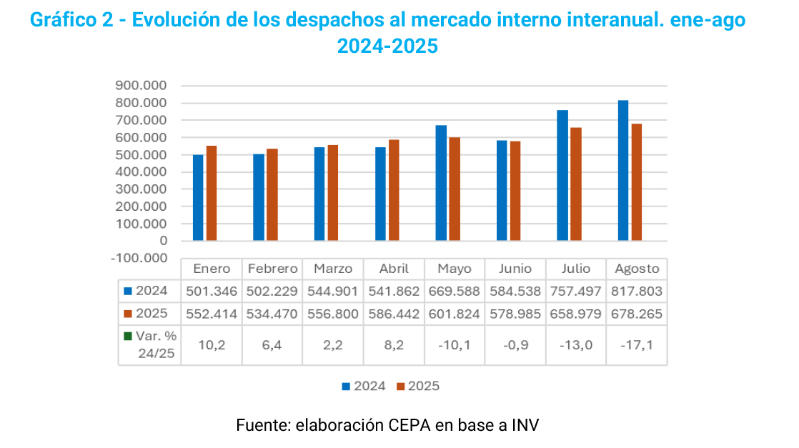 Si bien el acumulado de enero a agosto de 2025 muestra una baja menor, del 3,5% interanual, este resultado se explica por una base de comparación baja, ya que el primer cuatrimestre de 2024 estuvo marcado por la recesión inicial del gobierno de Javier Milei, producto de la megadevaluación y el ajuste fiscal implementados en los primeros meses de gestión. De este modo, la comparación con los valores de agosto —cuando ya se había atenuado el impacto más severo de esa recesión— refleja con mayor claridad la persistencia de la contracción del consumo interno.