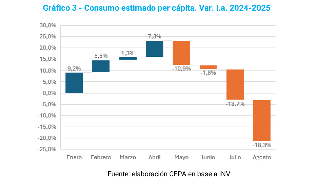 El consumo per cápita en agosto de 2025 se ubicó en 1,42 litros por habitante, lo que representa una disminución del 18,3% respecto del mismo mes de 2024.