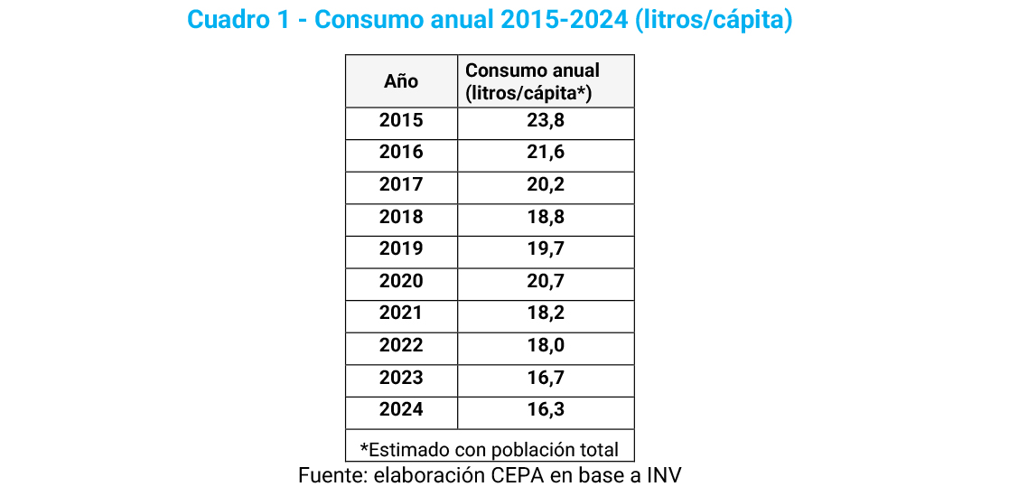 En síntesis, la tendencia descendente del consumo per cápita —que pasó de 23,8 litros anuales en 2015 a 16,3 en 2024— combina factores coyunturales vinculados al deterioro de los ingresos reales con un proceso estructural de reconfiguración de los hábitos de consumo y de la estructura productiva del sector.