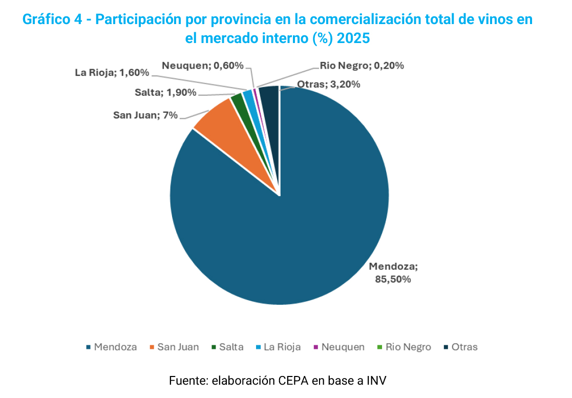 En términos de origen, el 88,5% del vino comercializado en el mercado interno durante agosto provino de Mendoza, seguida por San Juan (7%), Salta (1,9%), La Rioja (1,6%), Neuquén (0,6%) y Río Negro (0,2%). También registraron despachos las provincias de Buenos Aires, San Luis, La Pampa, Catamarca, Córdoba, Jujuy, Entre Ríos, Tucumán y Chubut.