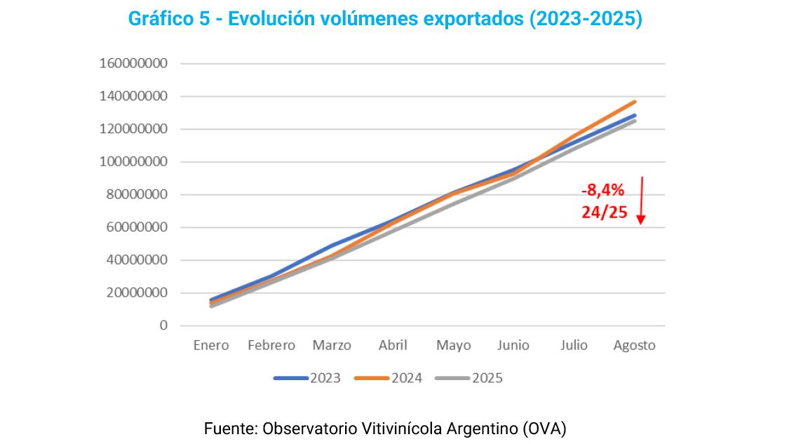Durante el período enero-agosto de 2025, las exportaciones de vinos y mostos continuaron mostrando una tendencia negativa en comparación con igual período de 2024. En términos generales, el volumen total de vinos despachados al exterior registró una disminución del -8,4% interanual.