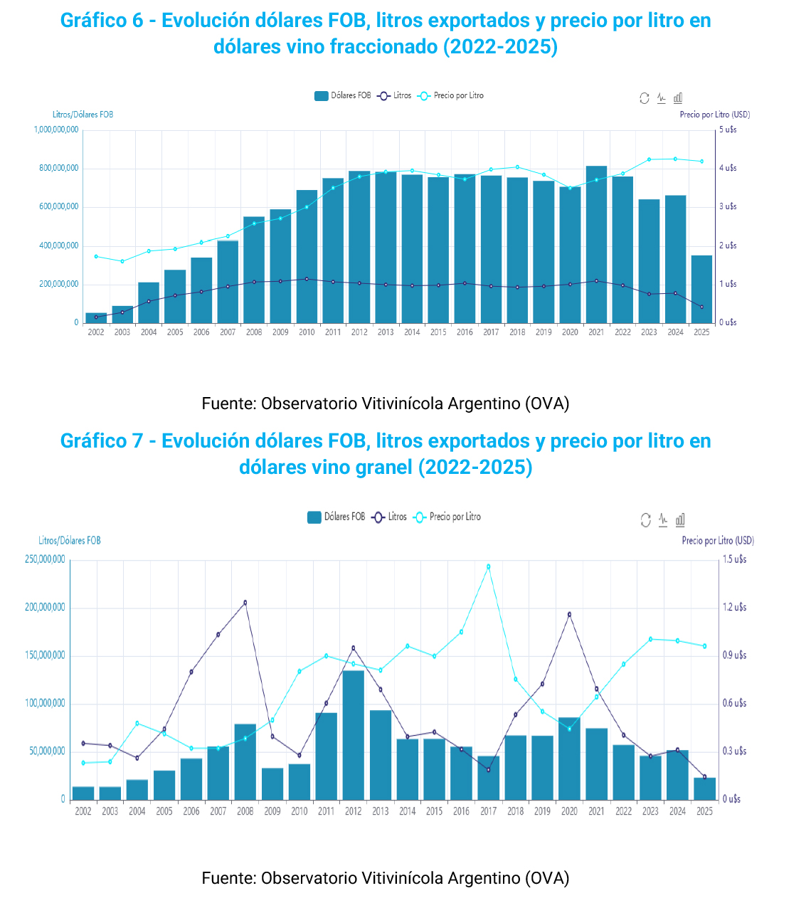 De acuerdo con los datos presentados, se observa además una caída significativa en los ingresos en dólares provenientes del vino a granel, junto con un estancamiento en las exportaciones de vino fraccionado, lo que evidencia un deterioro general en la performance externa del sector.