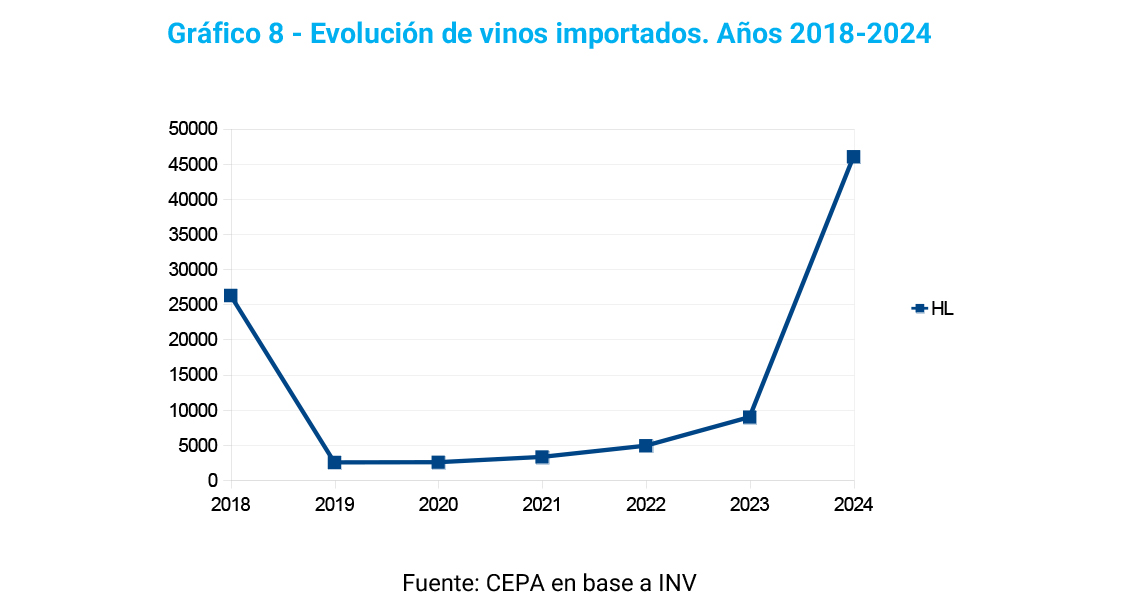 Entre enero y agosto de 2025, las exportaciones de vinos y mostos disminuyeron 8,4% interanual, con caídas más marcadas en el vino color (-9,8%) y en el vino a granel (-11,9%). Este desempeño negativo está asociado al atraso cambiario, los elevados costos logísticos y productivos y el encarecimiento relativo de los precios locales en dólares, lo que limita la inserción internacional del sector. - Aumento de las importaciones. En 2024, las importaciones de vino crecieron 415% interanual, alcanzando 45.971 hectolitros, con predominio del vino a granel proveniente de Chile. Este incremento refleja la pérdida de competitividad del producto nacional, en un contexto donde se desregula el sector e importar resulta más rentable que exportar, incluso en un país tradicionalmente productor y exportador.