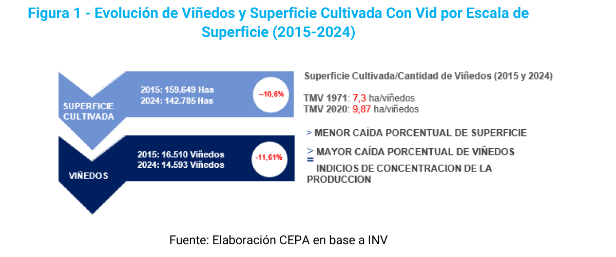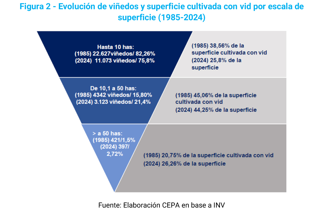 El análisis de la estructura productiva provincial muestra una alta presencia de pequeños productores, aunque con una marcada concentración de la superficie en manos de unidades de mayor tamaño. En 2024, el 75% de los viñedos mendocinos posee menos de 10 hectáreas, pero éstos solo concentran el 25,8% de la superficie cultivada con vid. En el otro extremo, el 7,4% de los viñedos —aquellos con más de 25 hectáreas— reúnen el 44,7% de la superficie total implantada.