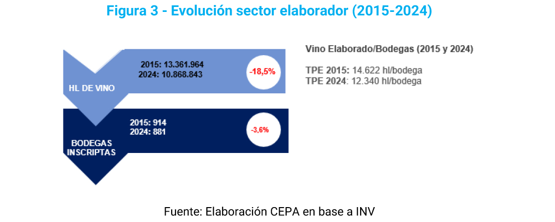 - La elaboración y fraccionamiento de vino se concentran en un número reducido de bodegas, mientras los productores más chicos enfrentan crecientes dificultades para sostener su actividad. Este proceso reduce la diversidad territorial y social del complejo vitivinícola y profundiza las asimetrías dentro de la cadena de valor.