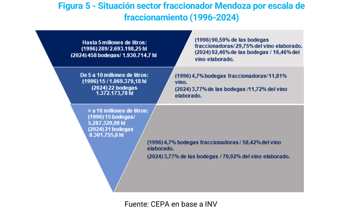Sin embargo, el análisis de los volúmenes despachados muestra que la concentración también persiste. En 1996, las grandes fraccionadoras (más de 100 mil hectolitros) representaban el 4,7% del total y despachaban el 58% del vino al mercado. En 2024, eran apenas el 3,7% de las fraccionadoras, pero concentraban el 71% de los despachos. En el otro extremo, en 1996 el 91% de las fraccionadoras más pequeñas (hasta 5 millones de litros) despachaban casi el 30% del vino; en 2024, el 93% de las pequeñas fraccionadoras redujo su porcentaje al 16%.