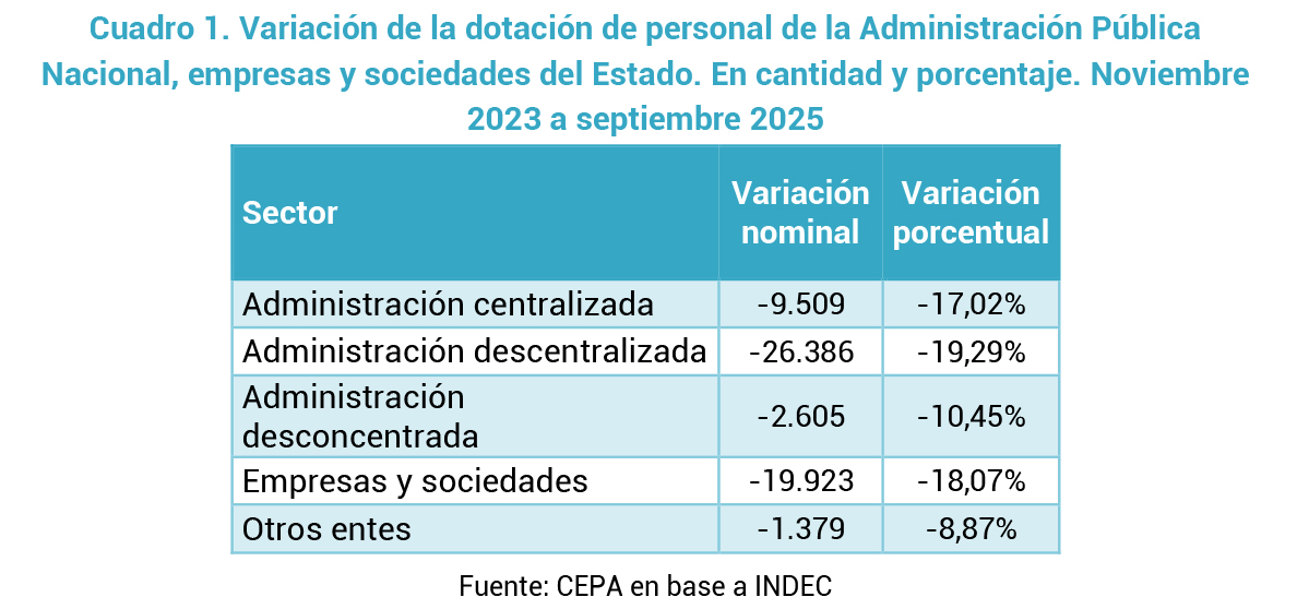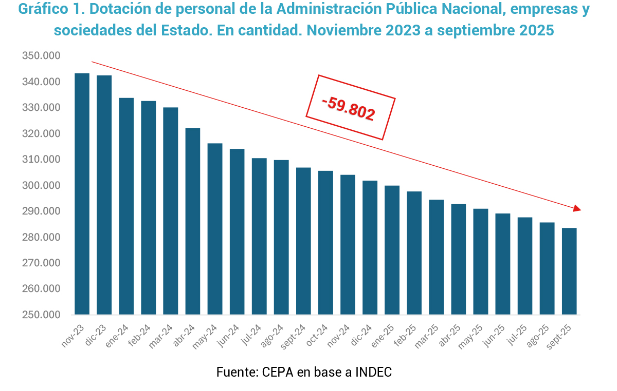 En ese marco, el gobierno sostiene la necesidad de reducir el tamaño del Estado y, fundamentalmente, ajustar a sus trabajadores. Ello puede confirmarse en el siguiente gráfico donde se observa un recorte persistente en el empleo público nacional durante todos los meses de la gestión libertaria. Entre noviembre de 2023 y septiembre de 2025, la dotación de personal se redujo en 59.802 puestos de trabajo, lo que implica una caída del 17,4%.