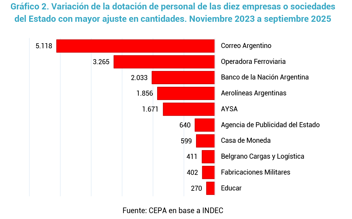 - El análisis por empresa muestra que el caso más significativo en términos absolutos es el del Correo Argentino, que encabeza el listado con 5.118despidos. Le siguen la Operadora Ferroviaria S.E., con 3.265 cesantías, y Banco Nación, con 2.033 despidos, mientras que el Aerolíneas Argentinas registra 1.856 desvinculaciones.