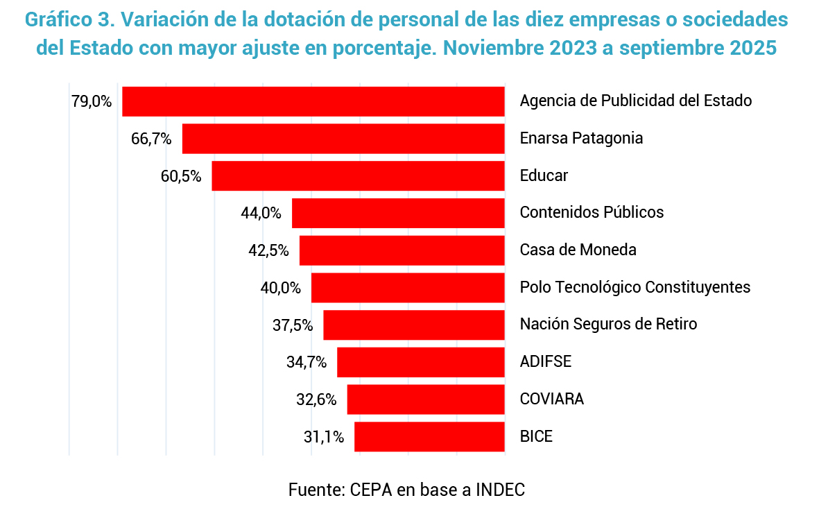 - En términos proporcionales, el recorte más drástico se dio en la ex Télam, donde se despidió a cerca del 80% del personal. Le sigue ENARSA Patagonia, y luego los casos de Educar S.A. y Contenidos Públicos S.E., que también presentan reducciones especialmente significativas.