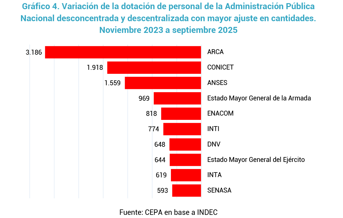 - En el ámbito de la Administración Pública Nacional (APN), incluyendo organismos desconcentrados y descentralizados, el caso más significativo en términos absolutos es el de ARCA, con 3.186 puestos de trabajo eliminados. Le siguen la CONICET, con 1.918 despidos, y el ANSES, con una reducción de 1.559 trabajadores.
