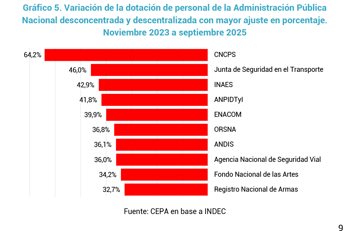 - En términos proporcionales, el recorte más severo se produjo en el Consejo Nacional de Coordinación de Políticas Sociales, que perdió el 64 % de su planta de personal. En segundo lugar, se ubica la Junta de Seguridad en el Transporte (JST), con una reducción del 46 %, y en tercer lugar el Instituto Nacional de Asociativismo y Economía Social (INAES), que sufrió un recorte del 43 % de su dotació