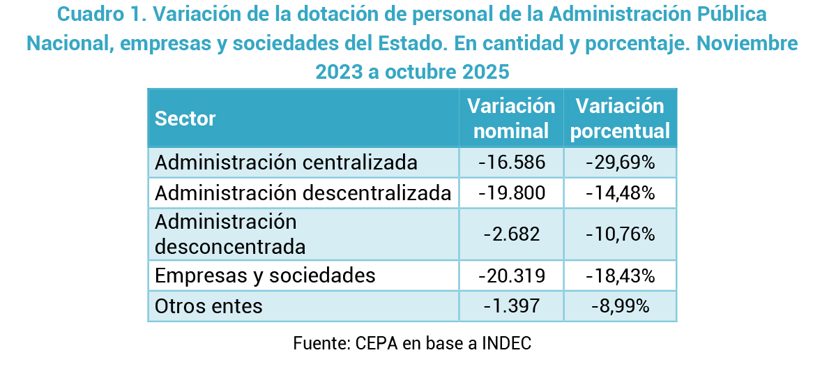 En ese marco, el gobierno sostiene la necesidad de reducir el tamaño del Estado y, fundamentalmente, ajustar a sus trabajadores. Ello puede confirmarse en el siguiente gráfico donde se observa un recorte persistente en el empleo público nacional durante todos los meses de la gestión libertaria. Entre noviembre de 2023 y octubre de 2025, la dotación de personal se redujo en 60.784 puestos de trabajo, lo que implica una caída del 17,7%.