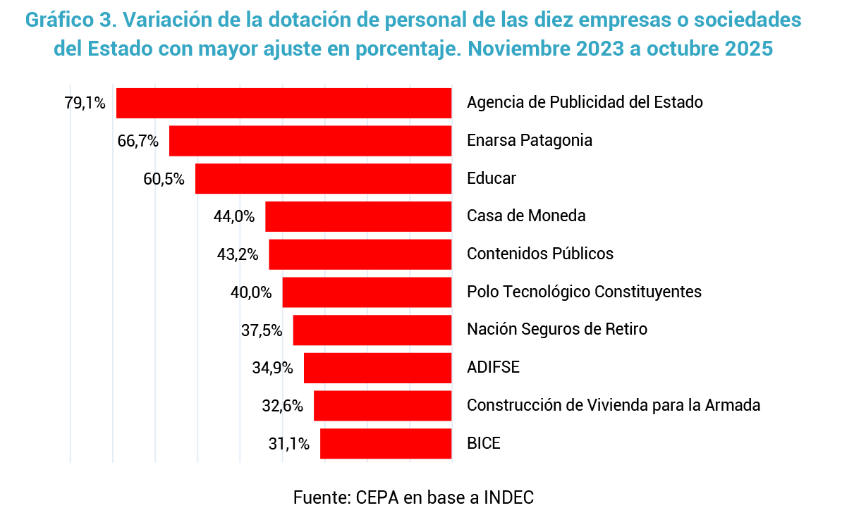 - En términos proporcionales, el recorte más drástico se dio en la ex Télam, donde se despidió a cerca del 80% del personal. Le sigue ENARSA Patagonia, y luego los casos de Educar S.A. y Contenidos Públicos S.E., que también presentan reducciones especialmente significativas.