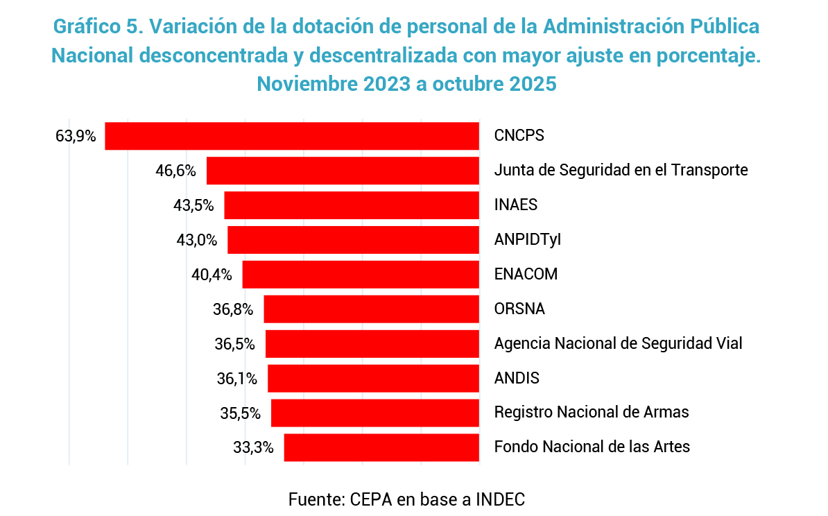 - En términos proporcionales, el recorte más severo se produjo en el Consejo Nacional de Coordinación de Políticas Sociales, que perdió el 64 % de su planta de personal. En segundo lugar, se ubica la Junta de Seguridad en el Transporte (JST), con una reducción del 46,6 %, y en tercer lugar el Instituto Nacional de Asociativismo y Economía Social (INAES), que sufrió un recorte del 43.5% de su dotación.