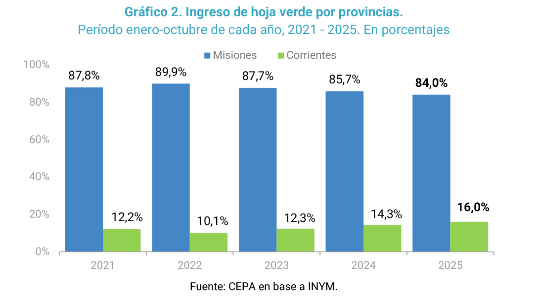 El procesamiento de hoja verde se da en las provincias de Misiones y Corrientes. Ambas se dividen en regiones, con distintos niveles de importancia en la producción. Durante el período enero-octubre de 2025 Misiones tuvo la participación más baja en los últimos 5 años en el ingreso de hoja verde, siendo de 84,0%, mientras que en el año 2022 tocó su máximo de 89,9% de representación. El noroeste de la provincia fue la única región que incrementó la cosecha respecto del mismo período de 2024, siendo que aumentó 6,9% i.a. La provincia de Corrientes durante los primeros 10 meses de 2025 representó el 16,0% del ingreso de hoja verde, representando el valor más alto de los últimos 5 años, aumentando la cosecha 33,8% respecto de 2021.