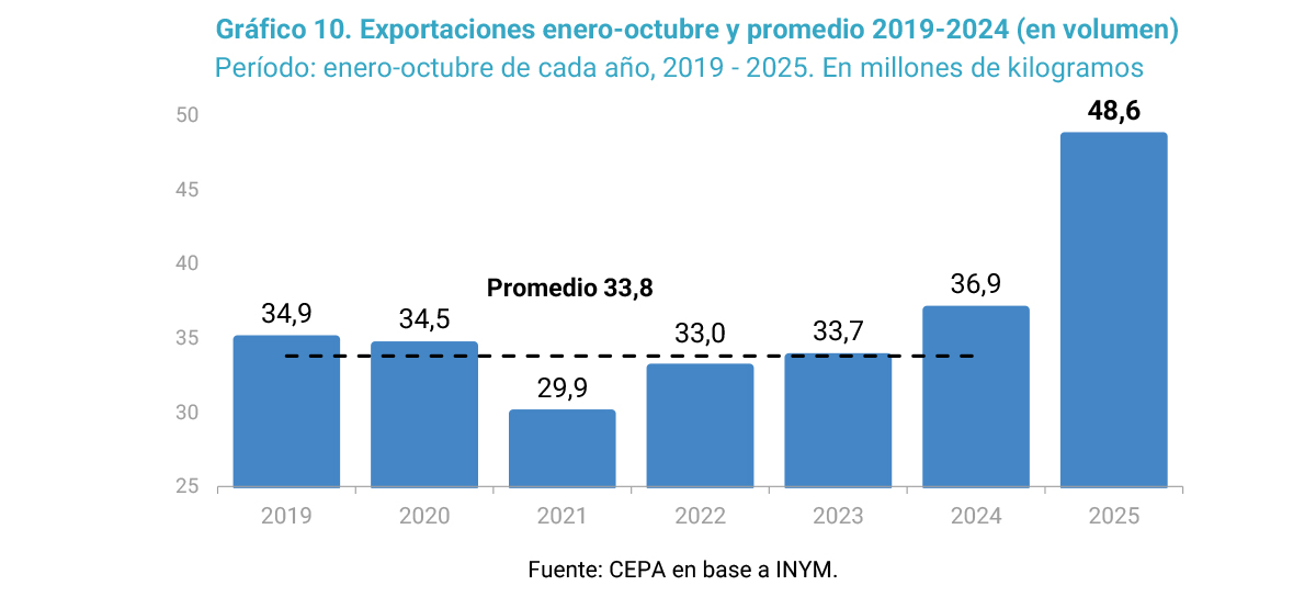 - En los primeros 10 meses de 2025 el consumo interno, producto de la desaceleración de la caída del poder adquisitivo de los salarios, aumentó 6,1% interanual (de 215,9 a 229,1 millones de kg). El registro acumulado enero-octubre cae 3,3% frente al mismo período de 2023 (237,0 millones de kg).