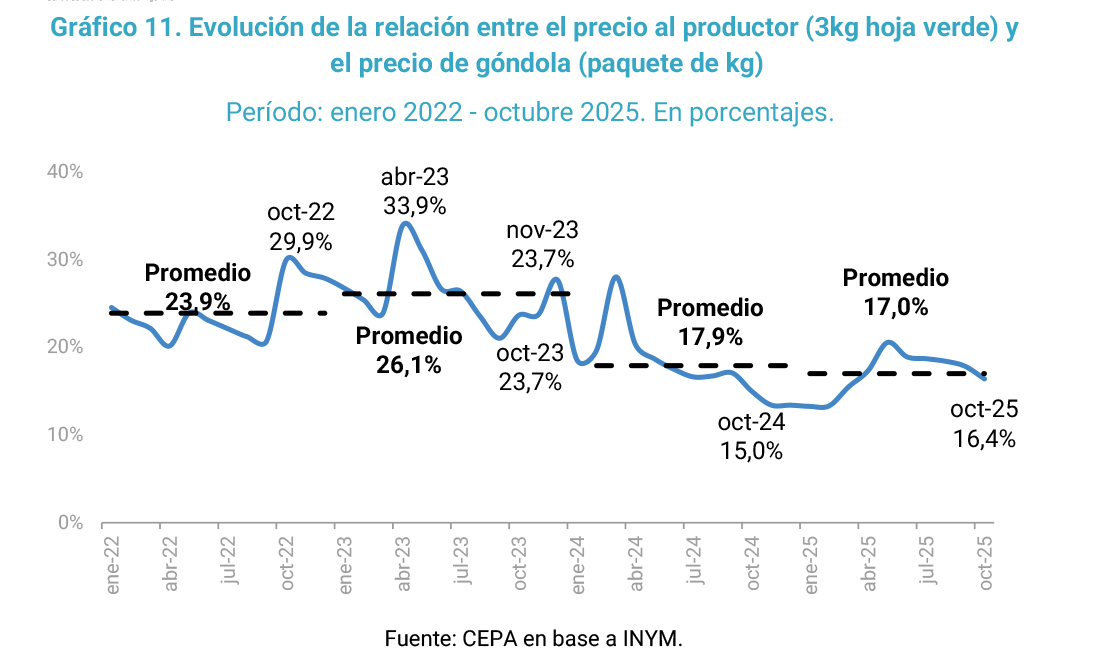 - Empeora en octubre 2025 la relación entre el precio que recibe el productor en relación con el precio de góndola: el productor sólo logra captar 16,4% del precio de venta en góndola. El promedio de los últimos 10 meses (17,0%) representa el peor momento desde 2019 de esta relación.