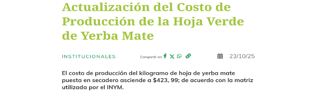 - El último precio máximo pagado a los productores yerbateros en octubre 2025 fue de $265. Teniendo en cuenta que el INYM informó que $424 es el costo para producir 1 kg de hoja de yerba mate (sin contemplar impuestos y rentabilidad), la pérdida que tienen los productores es de mínima de $159 por kg de hoja (equivale al 60% de lo que recibe el productor).