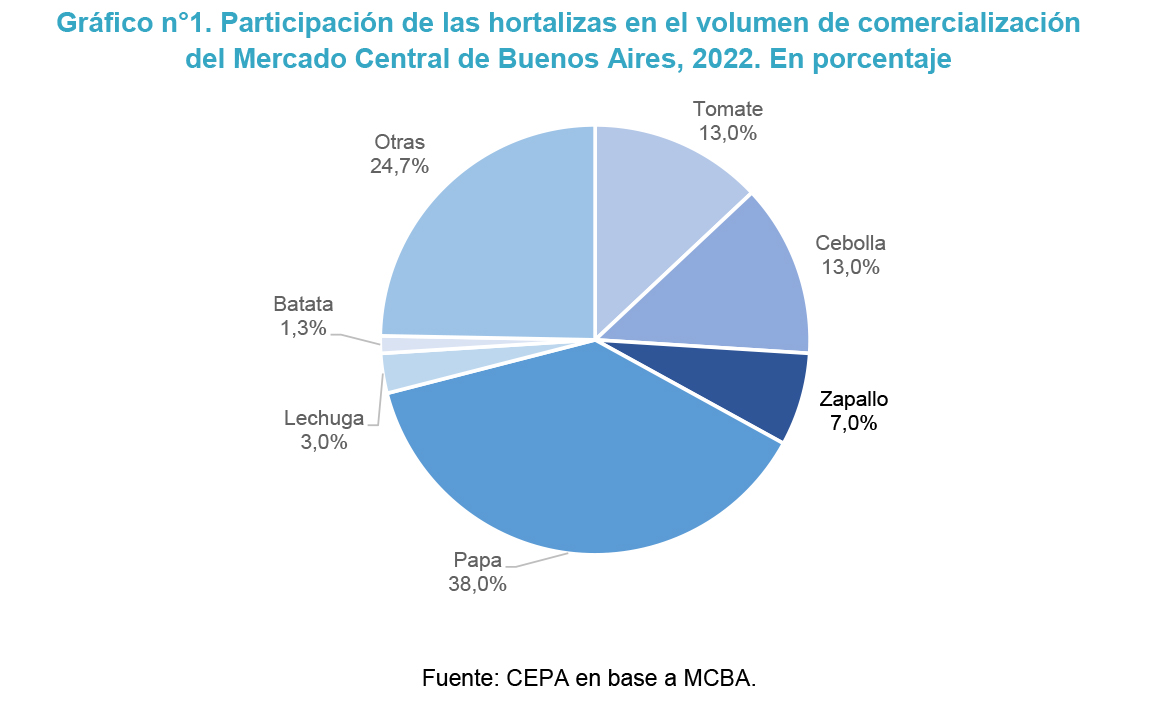 A los fines del abordaje metodológico, en este informe se considera una muestra de las especies incluidas en VTL que, en conjunto, representan 75,3% del volumen de comercialización del Mercado Central de Buenos Aires (MCBA): papa 38,0%, tomate 13,0%, zapallo 7.0%, cebolla 13,0%, lechuga 3,0% y batata 1,3%.