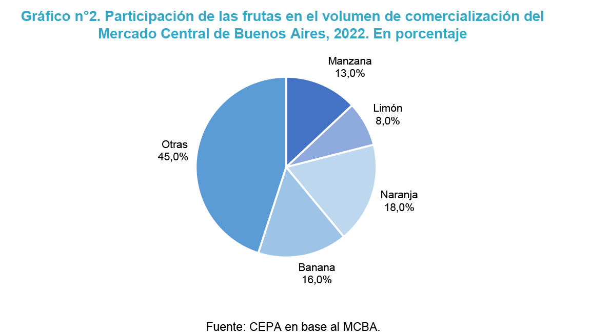 Las especies que conforman el segmento frutas son: banana, limón, manzana y naranja las cuales representan 55,0% del volumen comercializado: naranja 18,0%, banana 16,0%, manzana 13,0% y limón 8,0%.