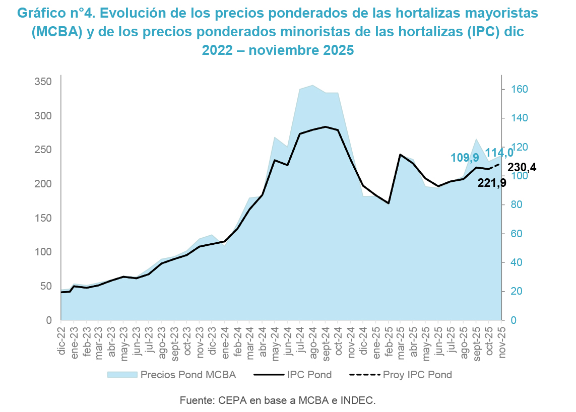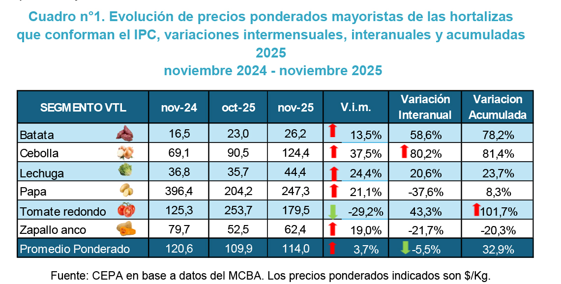 En el mes de noviembre 2025, las seis especies que conforman el segmento VTL del IPC muestran un aumento en el promedio de precios ponderados de 3,7% en el Mercado Central de Buenos Aires (MCBA) respecto del mes de octubre 2025.