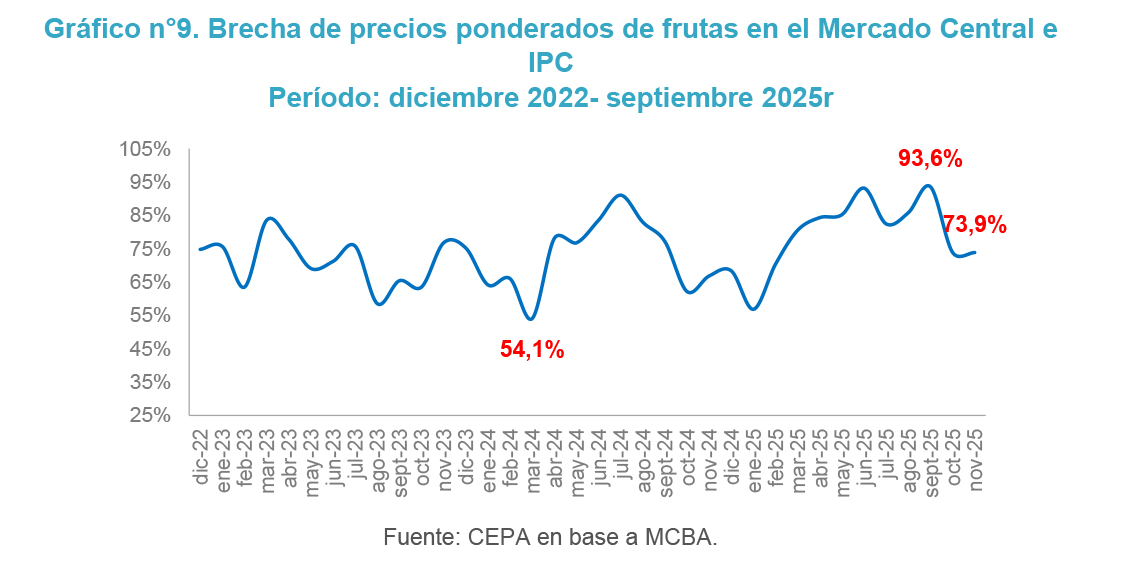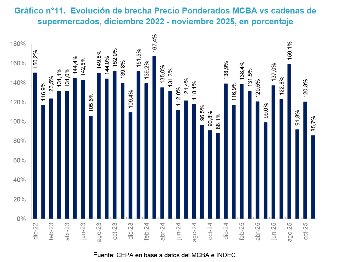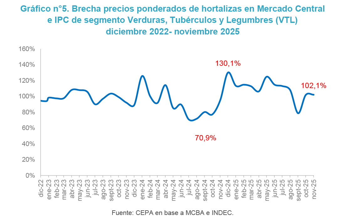 Al analizar la brecha entre el precio mayorista del MCBA y los precios minoristas relevados por el INDEC, se nota que entre diciembre de 2022 y noviembre de 2025 oscila entre 70,9% y 130,1%, con una mediana de 99,7%. Además, se observa que, debido a la variación de precios, la brecha en noviembre alcanzaría 102,1%, una diferencia de 0,3 puntos porcentuales respecto al mes de octubre.
