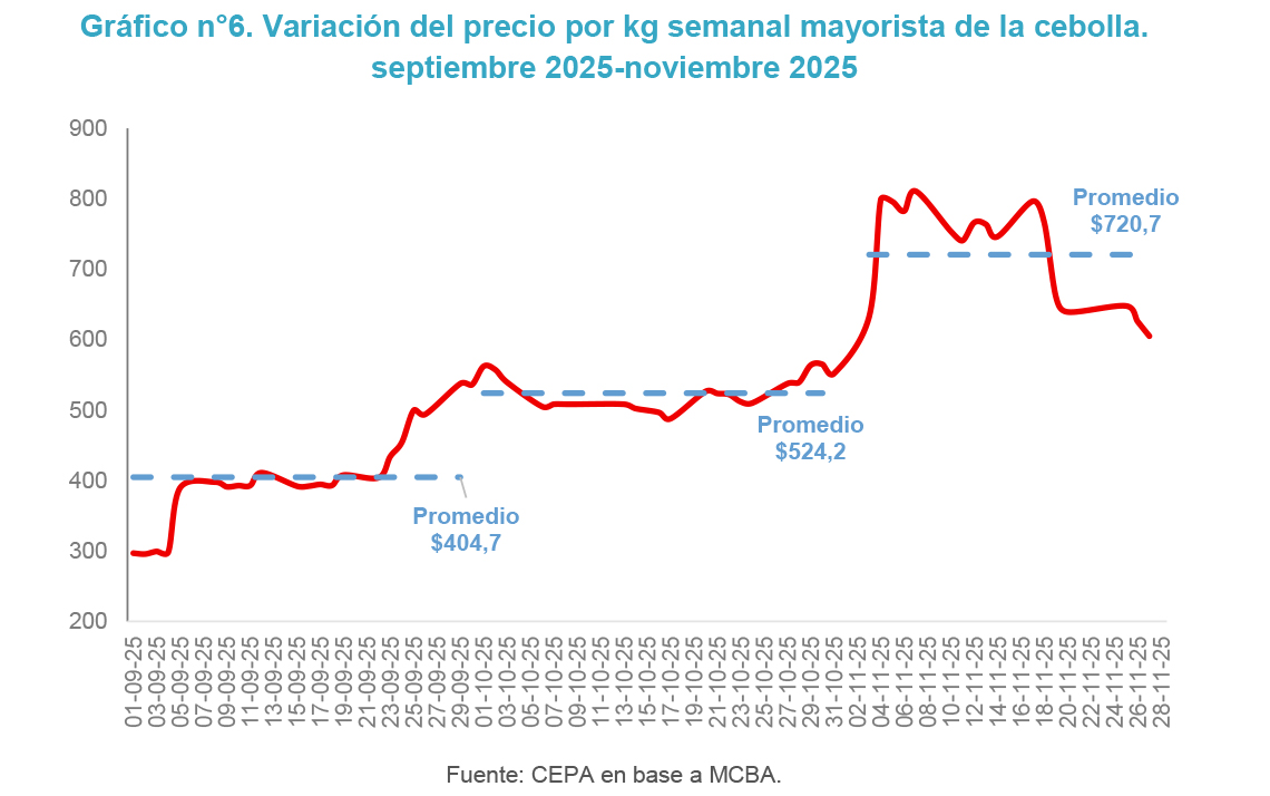 Este comportamiento se refleja en el Gráfico N° 6, donde se observa la evolución de los precios semanales de la cebolla en el MCBA. La línea punteada representa los precios promedio de septiembre, octubre y noviembre, mientras que la línea roja muestra el precio semanal registrado en el mercado central.