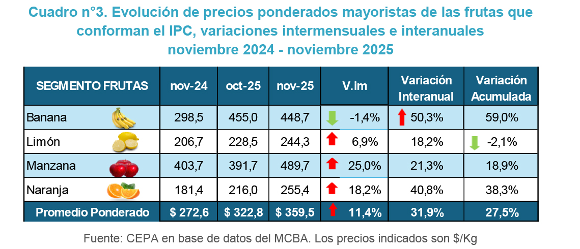 Durante el mes de noviembre el segmento frutas mostró un incremento en sus precios ponderados 11,4%. Mientras la banana fue la única fruta que contrajo sus precios ponderados 1,4%; todas las demás mostraron un aumento en los mismos: el limón 6,9%, la manzana 25,0%, y la naranja 18,2%.