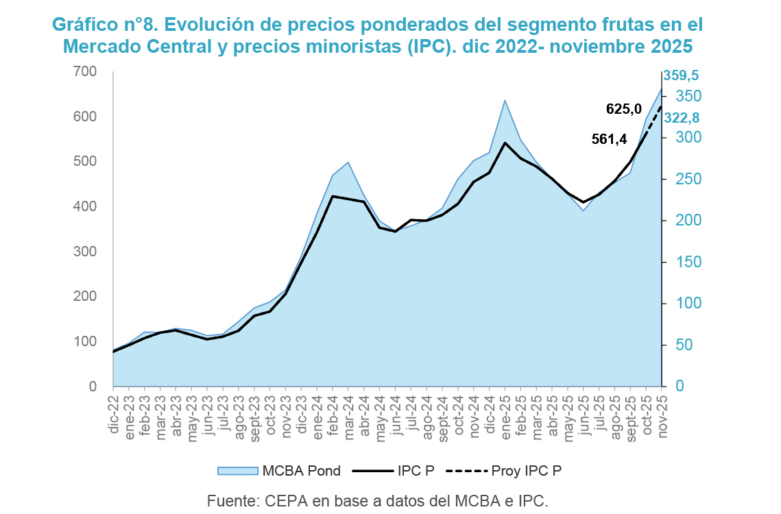 Al analizar las curvas del segmento (gráfico n°8) podemos ver que los valores relevados en el MCBA muestran un aumento de 11,4% respecto de octubre 2025, lo que permite proyectar un incremento en el precio del segmento frutas de un 11,3%. Ello impacta en 1,3% del ponderador de la división de Alimentos del IPC, lo cual provocaría una suba de 0,15% del rubro en el IPC de noviembre