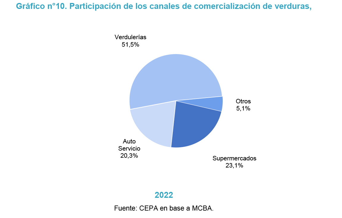 En la composición de los canales de comercialización en lo que refiere al rubro hortalizas, los supermercados ocupan 23,1% del volumen comercial, en tanto la mayoría se comercializa a través de verdulerías 51,5% y autoservicios 20,3%.
