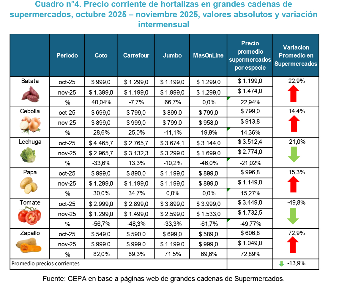 - Los supermercados mostraron una contracción en el promedio de precios corrientes de las 6 especies de hortalizas de 13,9% respecto del mes de octubre. Mientras que el tomate y la lechuga contrajeron sus precios 49,8%, y 21,0% respectivamente, el zapallo, la batata, la papa y la cebolla mostraron un aumento en sus precios de 72,9%, 22,9%, 15,3% y 14,4% respectivamente.