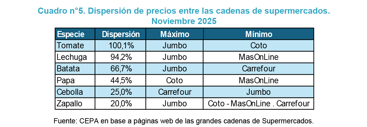 El cuadro N° 5 representa la dispersión de precios relevados en las cadenas de supermercados seleccionadas para el informe. El tomate muestra la mayor dispersión de precios entre los supermercados: 100,1%, siendo Coto la cadena que muestra el menor precio y Jumbo el precio más alto. Por el contrario, la especie que muestra la menor dispersión es nuevamente el zapallo: 20,0%. La cadena que muestra la mayor dispersión de precios es Jumbo, mientras que Carrefour, MasOnLine y Coto coinciden con la mínima dispersión.