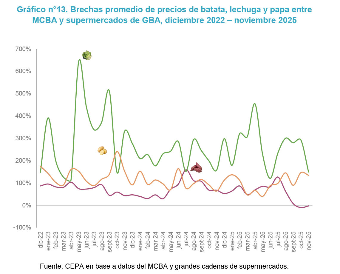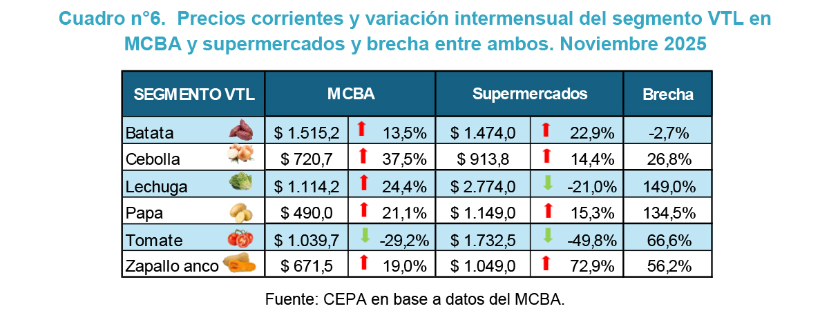 Cabe destacar que, en noviembre de 2025, la brecha de la batata a pesar de haber aumentado respecto del mes de octubre sigue manteniendo la menor diferencia entre los precios del MCBA y los supermercados, (cuadro n°7).