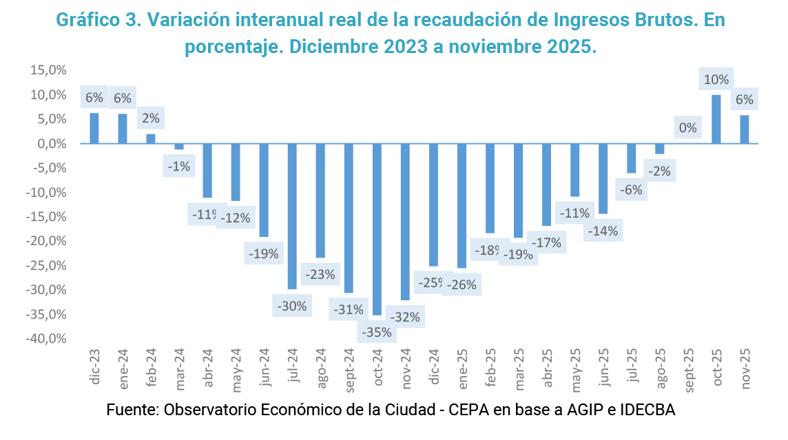 Analizando la dinámica de la recaudación propia de los últimos 24 meses, especialmente del Impuestos sobre los Ingresos Brutos, que como ya se advirtió es por lejos el principal ingreso de la Ciudad, se percibe un incremento real sostenido desde marzo 2023 hasta octubre de ese mismo año. A partir de octubre de 2023, Ingresos Brutos entra en un notable sendero de caída real de la recaudación. Entre octubre de 2023 y noviembre 2025 dicha caída es del 28,89% en términos reales, reflejando una desaceleración de dicha caída acumulada desde el máximo de -40% en marzo de este año.