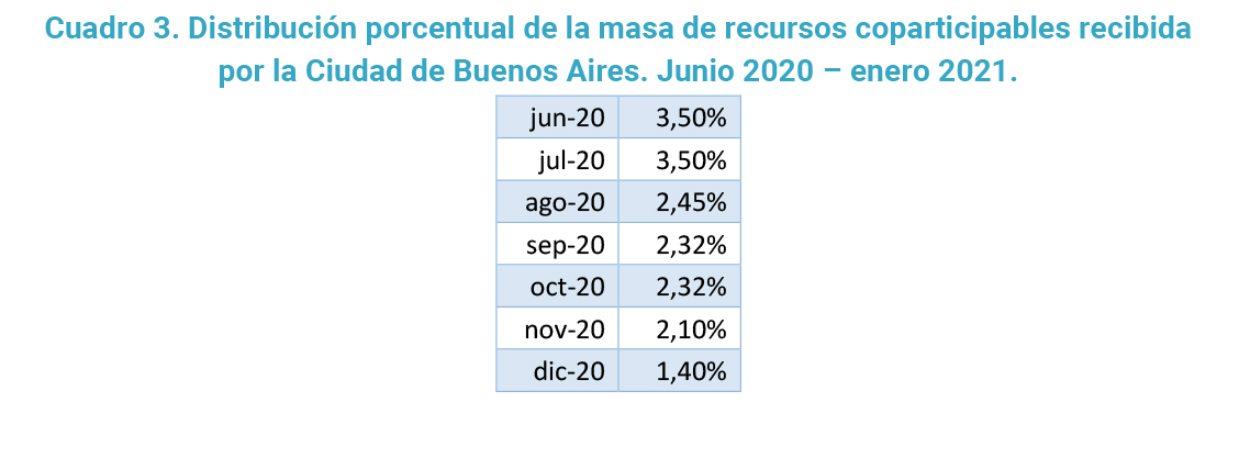Entonces, en 2020, el Gobierno Nacional fijó el coeficiente de la Ciudad en 2,32%, compuesto por el 1,4% histórico, más el 0,92% adicional estimado. Y estableció que, una vez aprobada la ley de traspaso, se volvería al coeficiente de 1,4%, más un adicional de 24 mil millones de pesos anuales, actualizables trimestralmente, monto que surgió de una estimación de los gastos que afrontaría la Ciudad por el traspaso de funciones. Dicha modificación se dio durante el segundo semestre de 2020, cuando la Nación fue reduciendo gradualmente el porcentaje de la masa total de recursos coparticipables recibida por la CABA, hasta llegar al 1,4% en diciembre de 2020.