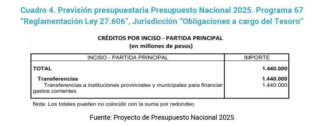 Los giros de dichos fondos no se realizarán junto al resto de los fondos coparticipables, sino que serán transferencias del Tesoro Nacional en el marco del Programa 67 “Reglamentación Ley 27.606” y “Cumplimiento de Medida Cautelar CSJN 1864/2022”, que revista en la Jurisdicción “Obligaciones a Cargo del Tesoro”.