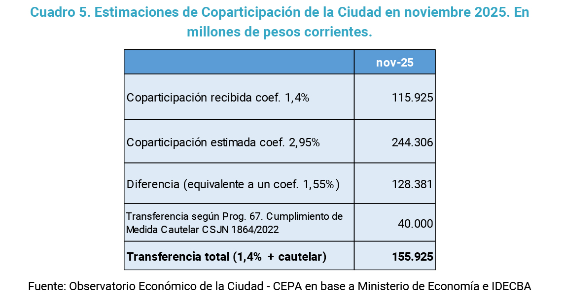 El CEPA realizó una estimación para conocer los montos de dinero en disputa. Durante el mes de noviembre de 2025 la Ciudad recibió más de 115 mil millones de pesos de coparticipación y financiamiento educativo, equivalente al 1,4% de la masa de fondos coparticipables. El monto equivalente al coeficiente de 1,55% de coparticipación, es decir el adicional que resulta de la medida cautelar de la Corte Suprema, debería ser de 128 mil millones de pesos. En esta ocasión, la Nación transfirió a la Ciudad en concepto de la cautelar de la Corte el monto de 40 mil millones de pesos, o sea 88 mil millones de pesos menos de lo estimado. De esta forma, el monto efectivamente recibido durante este periodo fue de 155,9 mil millones de pesos, cuando según el coeficiente de 2,95% debiera haber sido de 244 mil millones de pesos.