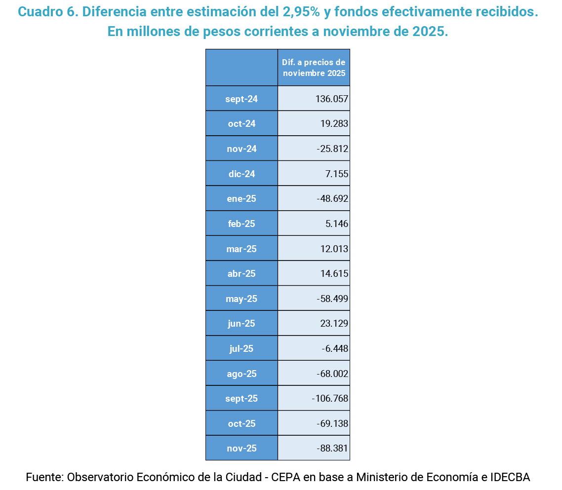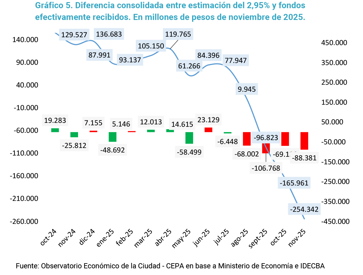 Si comparamos las transferencias efectivas realizadas por el Tesoro de la Nación con lo que CABA debería recibir de acuerdo con la cautelar de la CSJN, observamos variaciones significativas de un mes a otro, a veces por exceso y otras por defecto, sin seguir un patrón que permita identificar un comportamiento uniforme. En otras palabras, las diferencias mensuales entre uno y otro concepto desde septiembre del 2024 no coinciden con el coeficiente estipulado del 2,95%. Durante noviembre de 2025 la diferencia fue de -88 mil millones de pesos.