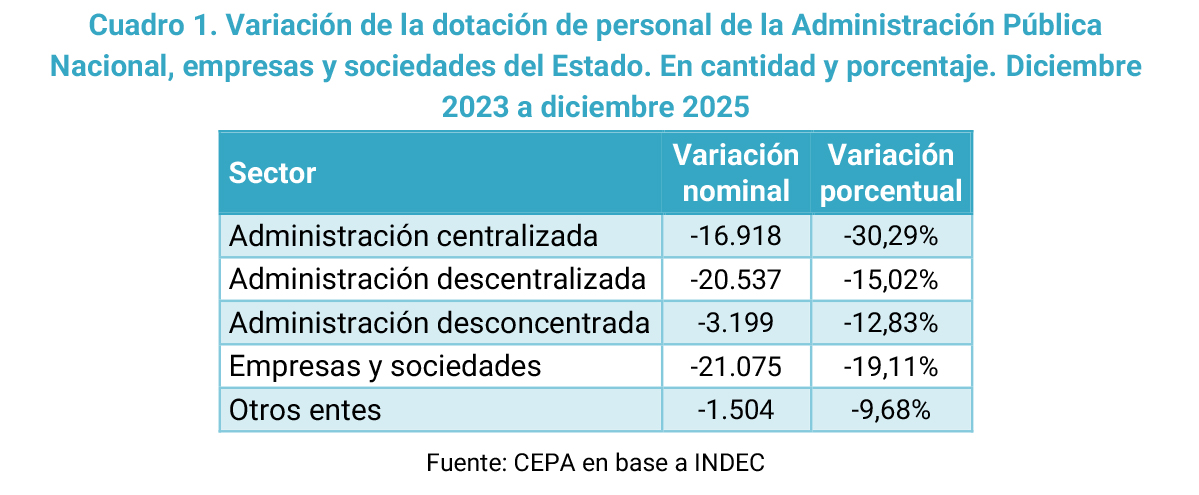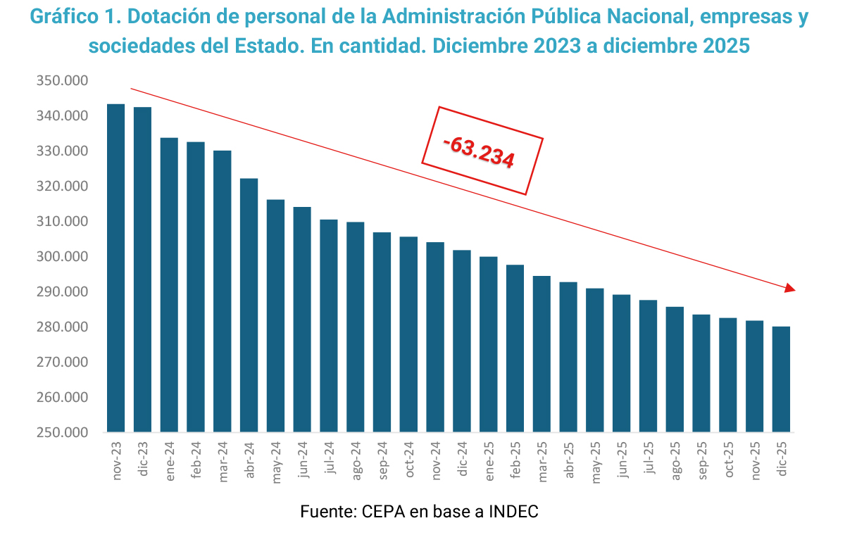 En ese marco, el gobierno sostiene la necesidad de reducir el tamaño del Estado y, fundamentalmente, ajustar a sus trabajadores. Ello puede confirmarse en el siguiente gráfico donde se observa un recorte persistente en el empleo público nacional durante todos los meses de la gestión libertaria. Entre diciembre de 2023 y diciembre de 2025, la dotación de personal se redujo en 63.234 puestos de trabajo, lo que implica una caída del 18,4%.