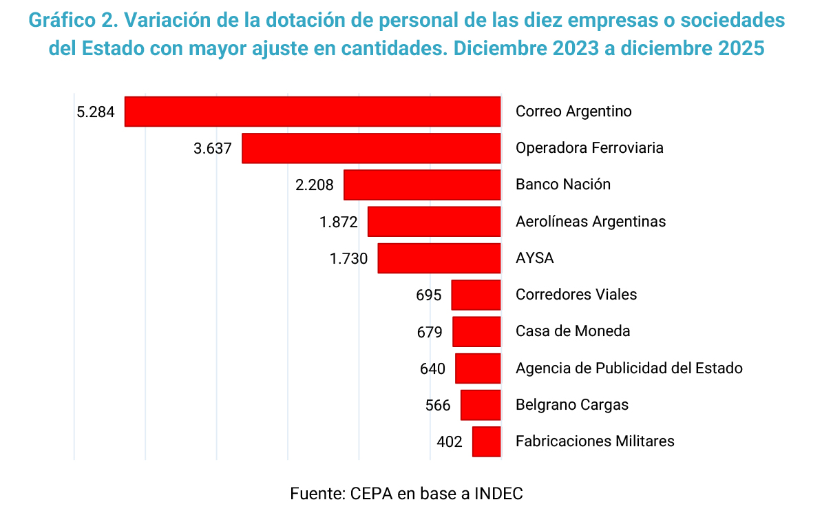 - El análisis por empresa muestra que el caso más significativo en términos absolutos es el del Correo Argentino, que encabeza el listado con 5.284 despidos. Le siguen la Operadora Ferroviaria S.E., con 3.637 cesantías, y Banco Nación, con 2.208 despidos, mientras que el Aerolíneas Argentinas registra 1.872 desvinculaciones.