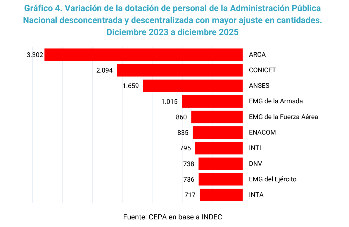 - En el ámbito de la Administración Pública Nacional (APN), que incluye organismos desconcentrados y descentralizados, el caso más significativo en términos absolutos es el de ARCA, con 3.302 puestos de trabajo eliminados. Le siguen la CONICET, con 2.094 despidos, y el ANSES, con una reducción de 1.659 trabajadores.