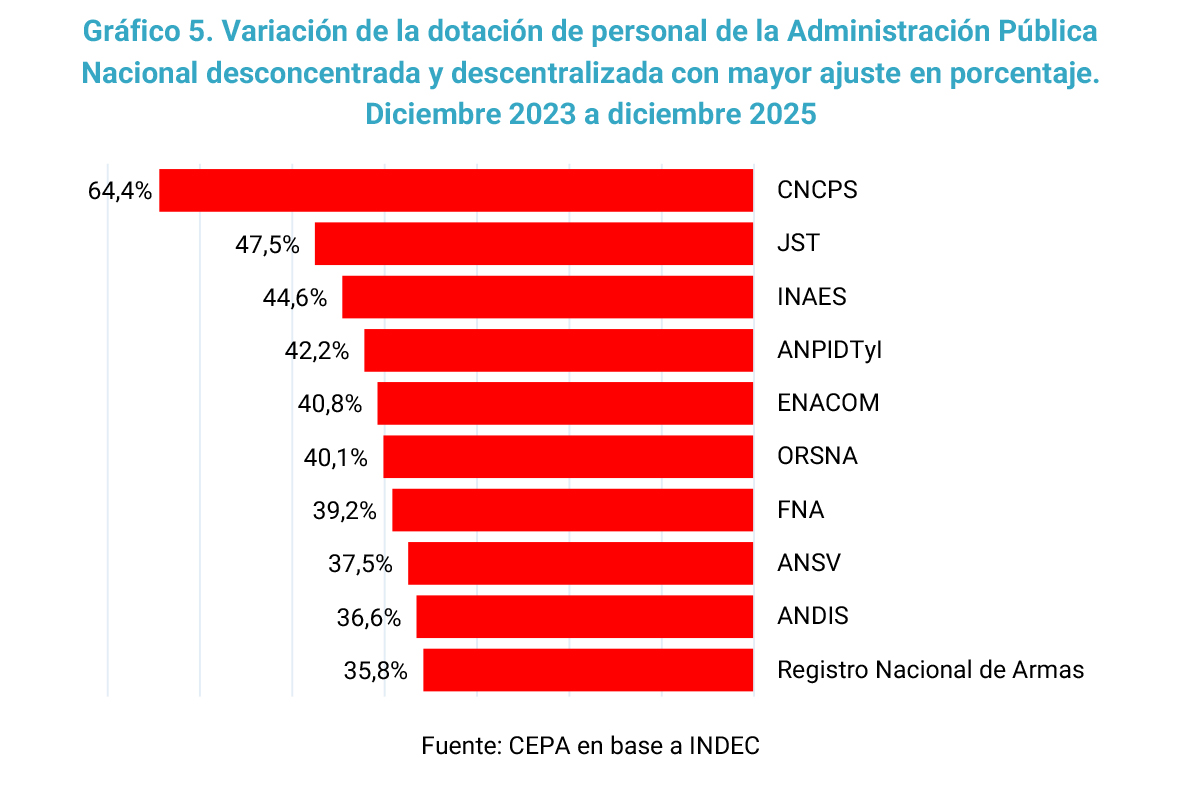 - En términos proporcionales, el recorte más severo se produjo en el Consejo Nacional de Coordinación de Políticas Sociales, que perdió el 64,4% de su planta de personal. En segundo lugar, se ubica la Junta de Seguridad en el Transporte (JST), con una reducción del 47,5 %, y en tercer lugar el Instituto Nacional de Asociativismo y Economía Social (INAES), que sufrió un recorte del 44,6% de su dotación.