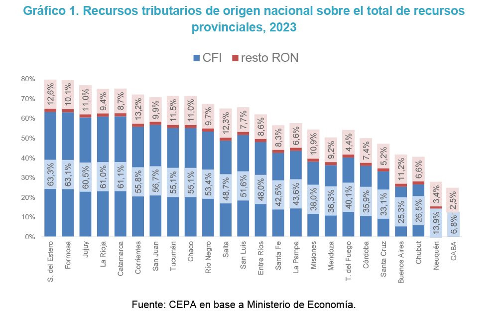 En lo que respecta a las transferencias tributarias de origen nacional, éstas representan una buena parte de los ingresos provinciales: en promedio, alcanzan 44,8% en recursos de Coparticipación Federal de Impuestos (CFI), mientras que si se incorpora el resto de transferencias de origen nacional (RON), el guarismo asciende a 54,0% del total.