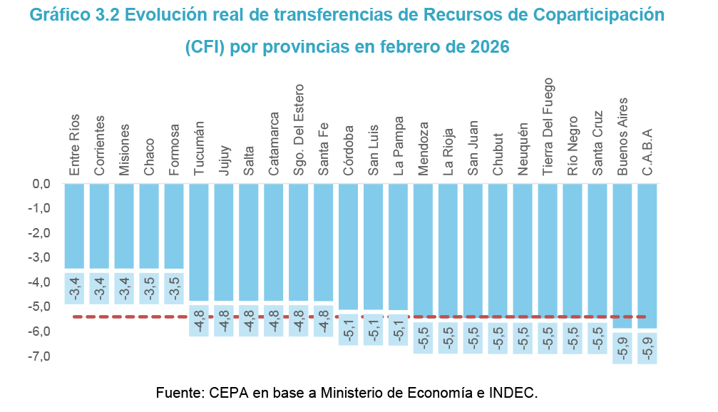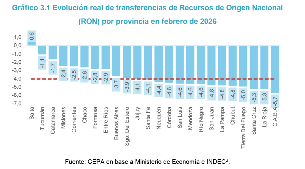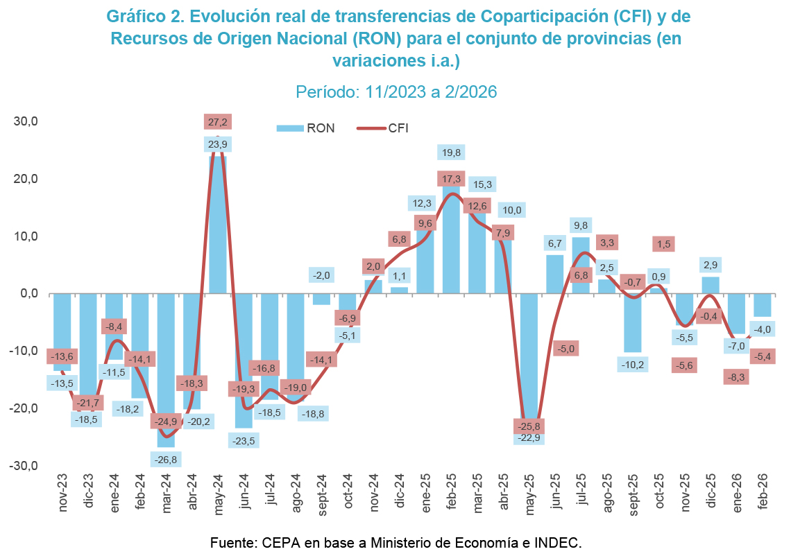 - En febrero de 2026, los Recursos de Origen Nacional (RON) transferidos a las provincias cayeron 4,0% interanual en términos reales y la Coparticipación Federal de Impuestos (CF) lo hizo 5,4% interanual.