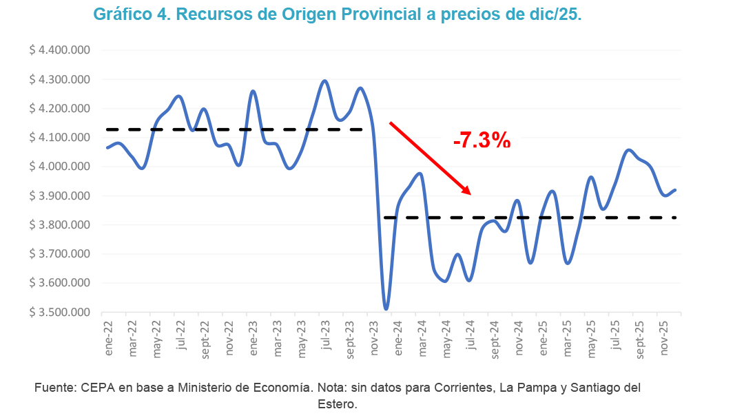 Estas significativas caídas en los Recursos de Origen Nacional se complementan con una contracción adicional del 7,3% en términos reales desde la asunción de Milei (promedio dic/23–dic/25) en comparación con el período previo (ene/22–nov/23).